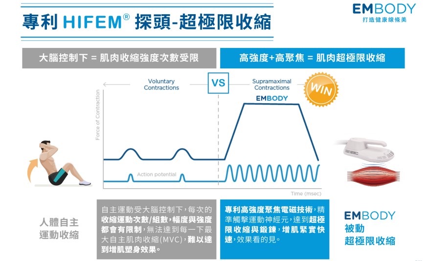 EMBODY內建 HIFEM專利技術,誘發肌肉產生極限收縮,而肌肉處於極限收縮狀態時,會促進核心肌肉內部深層的結構重建來適應這種極限狀態。達到肌纖維體積增大(肌肉肥大,Hypertrophy),從而讓新的蛋白質鏈和肌原纖維的產生(肌肉增生,Hyperplasia),最終達到肌肉密度和體積增加。同時,極限收縮運動也使腎上腺素的水平上升,激皮下脂肪分子分解為甘油(glycerol)及游離脂肪酸(free fatty acid),而游離脂肪酸將會被帶到線粒體(mitochondria)之內引發脂肪細胞大量裂解,進而誘發脂肪細胞凋亡,並由身體自然代謝。