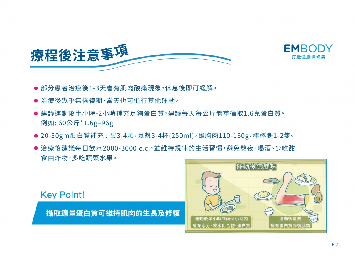 .建議運動後半小時2小時補充足夠蛋白質,建議每天每公斤體重攝取1.6克蛋白質。