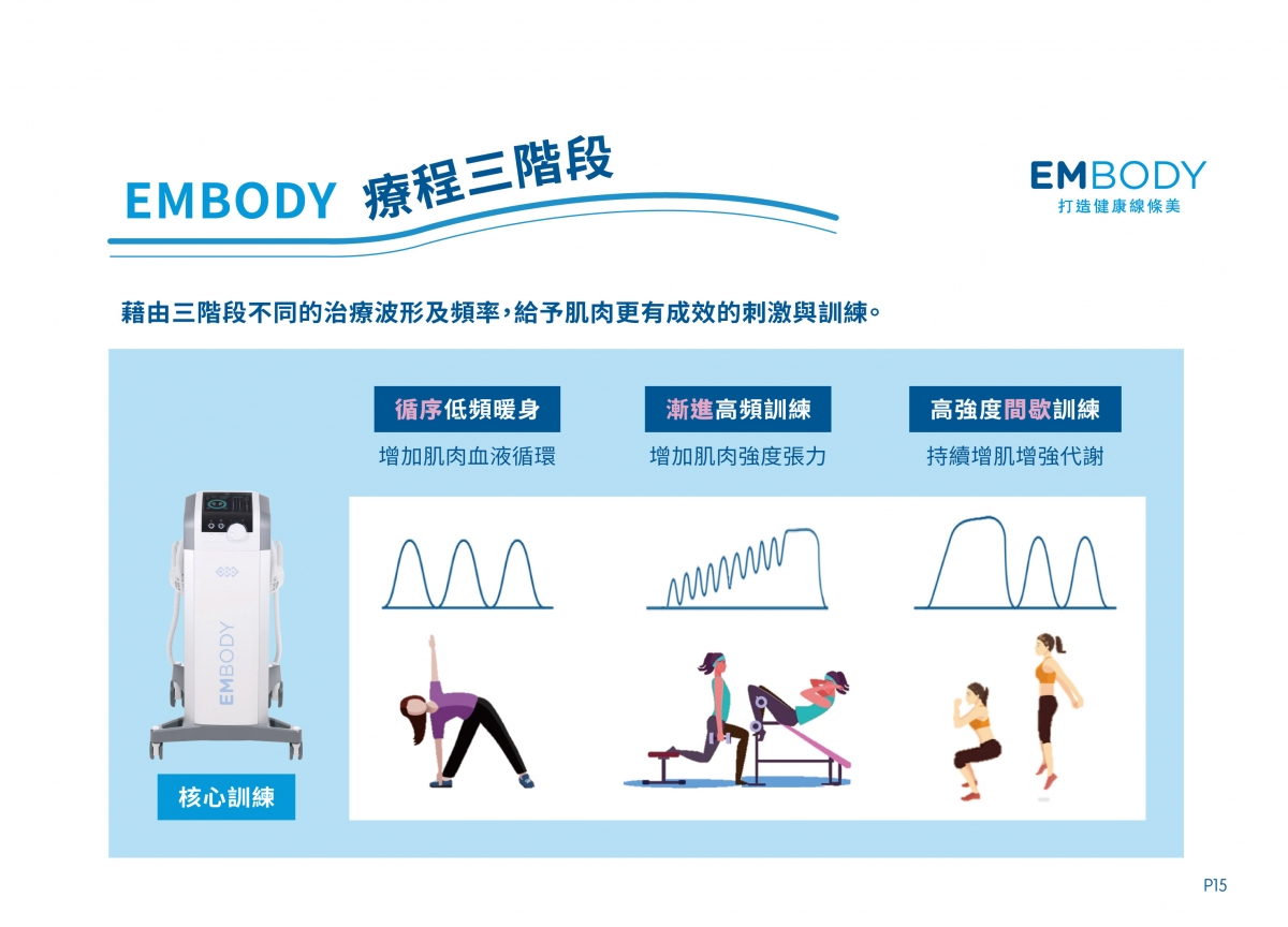藉由三階段不同的治療波形及頻率,給予肌肉更有成效的刺激與訓練。
