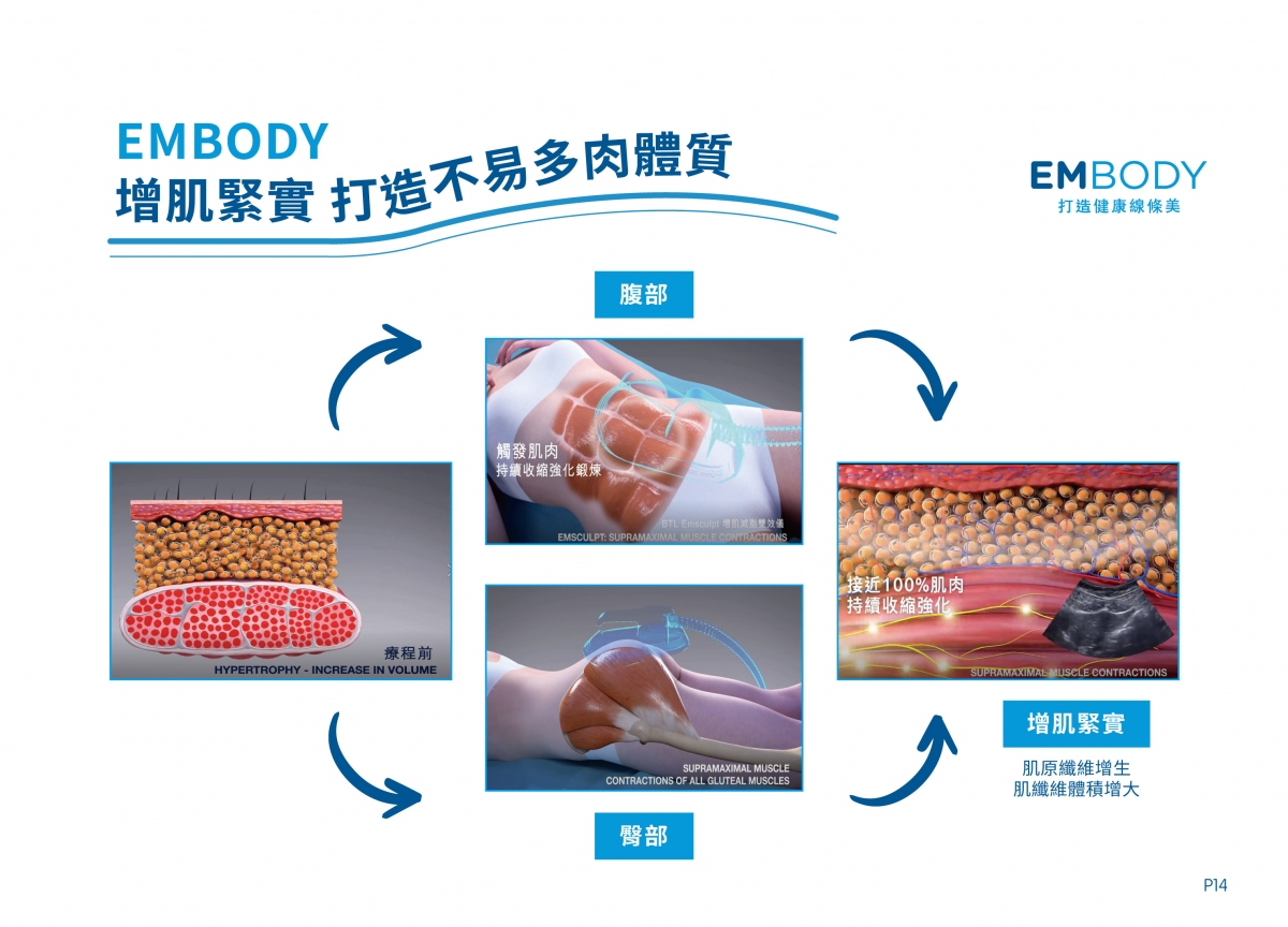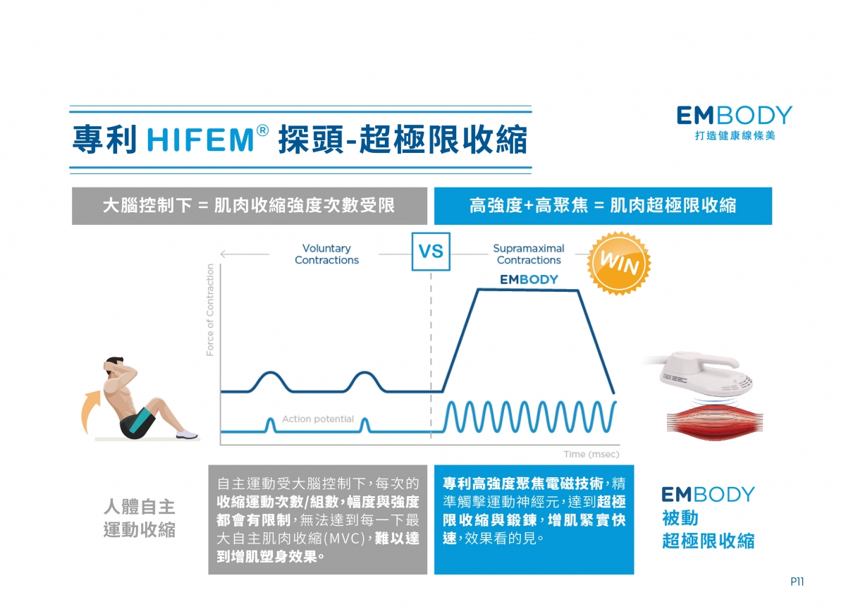 專利高強度聚焦電磁技術,精準觸擊運動神經元,達到超極限收縮與鍛鍊,增肌緊實快速,效果看的見。