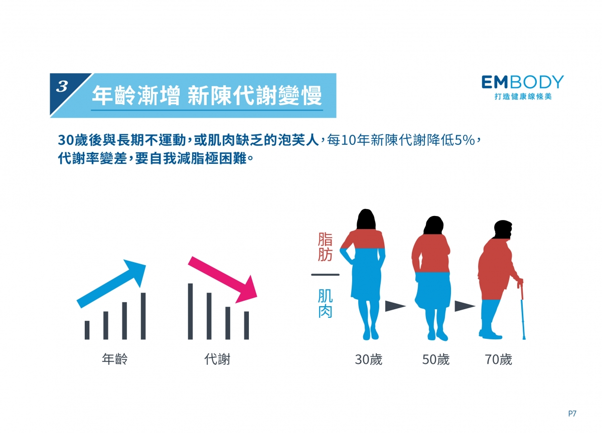 30歲後與長期不運動,或肌肉缺乏的泡芙人,每10年新陳代謝降低5%,