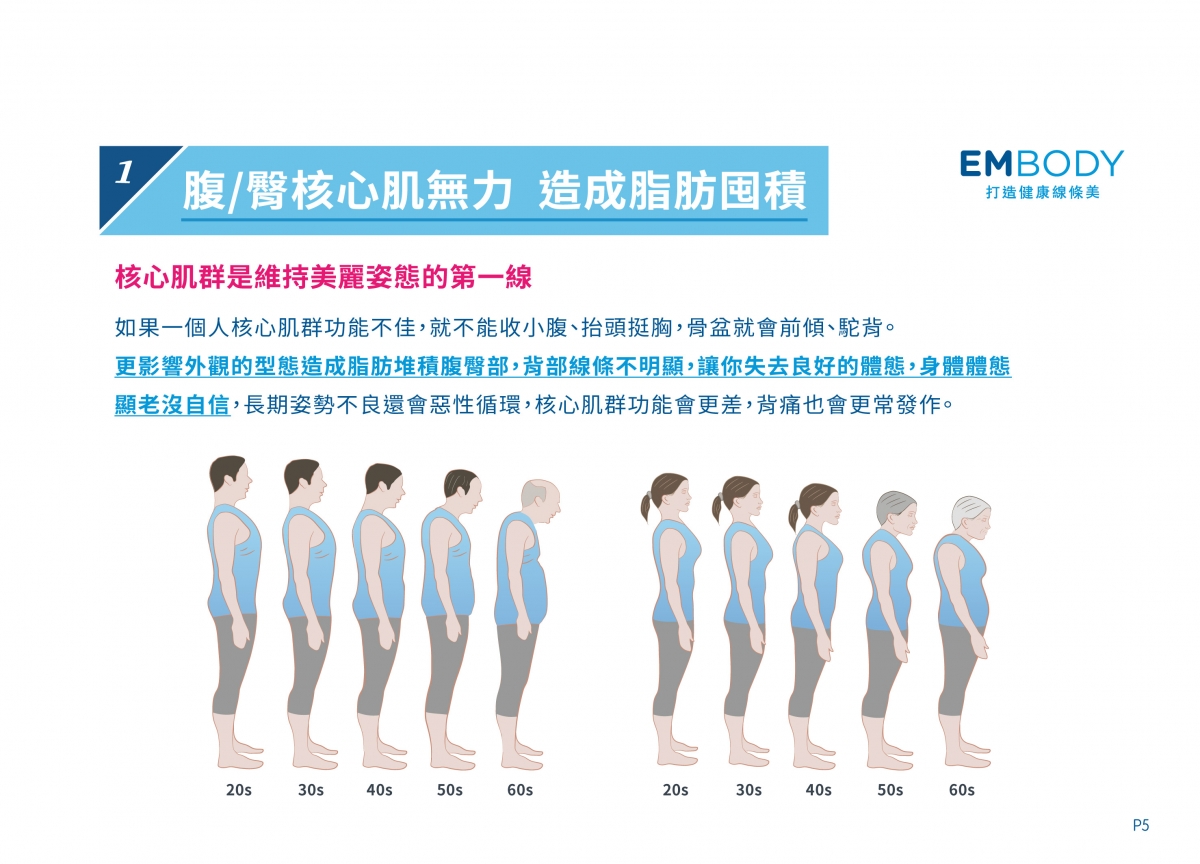 更影響外觀的型態造成脂肪堆積腹臀部,背部線條不明顯,讓你失去良好的體態,身體體態顯老沒自信,長期姿勢不良還會惡性循環,核心肌群功能會更差,背痛也會更常發作。